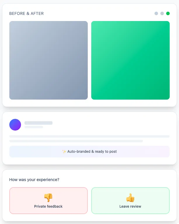 DoneRight helps service businesses easily capture before‑and‑after results, publish them instantly, and turn happy customers into public reviews — without adding marketing work.